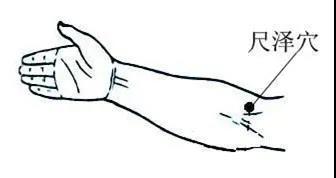 尺泽穴:位于屈肘仰掌,在肘窝横纹中央,大筋(肱二头肌腱)外侧凹陷中。