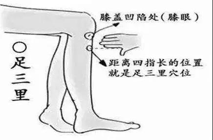 足三里穴:位于小腿外侧,犊鼻下3寸,犊鼻与解溪连线上。